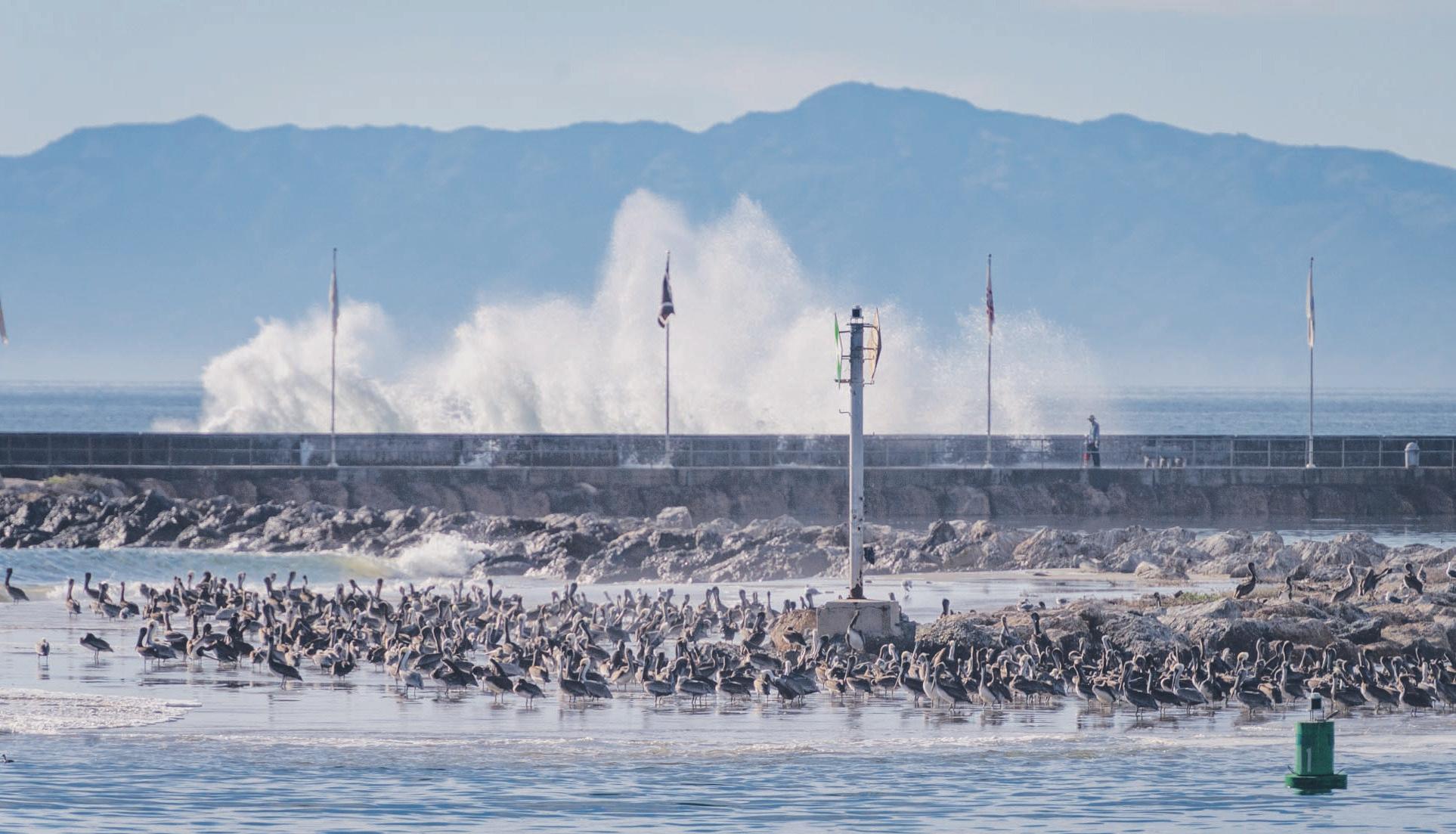 A massive flock of pelicans roosts near Santa Barbara Harbor on Friday.
