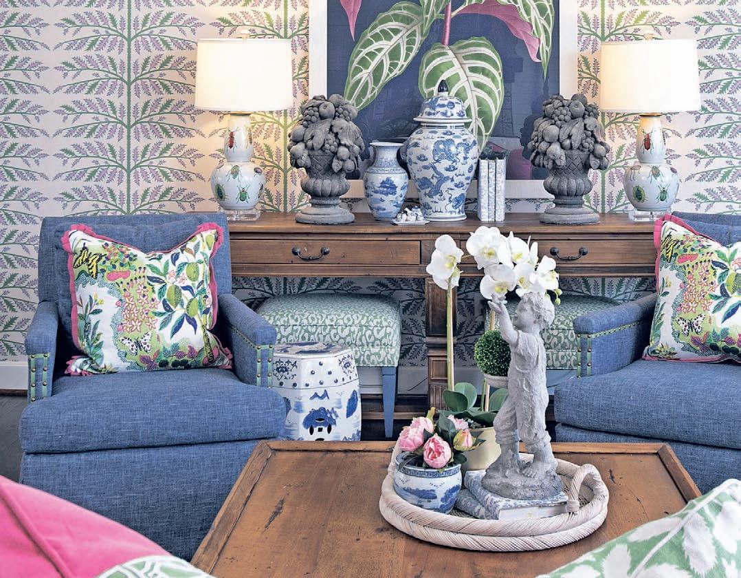 In the dining room, bamboo Chippendale chairs are pulled up to an expansive table, twin upholstered chairs in a coral colorway flank either side in a popular otomi pattern.