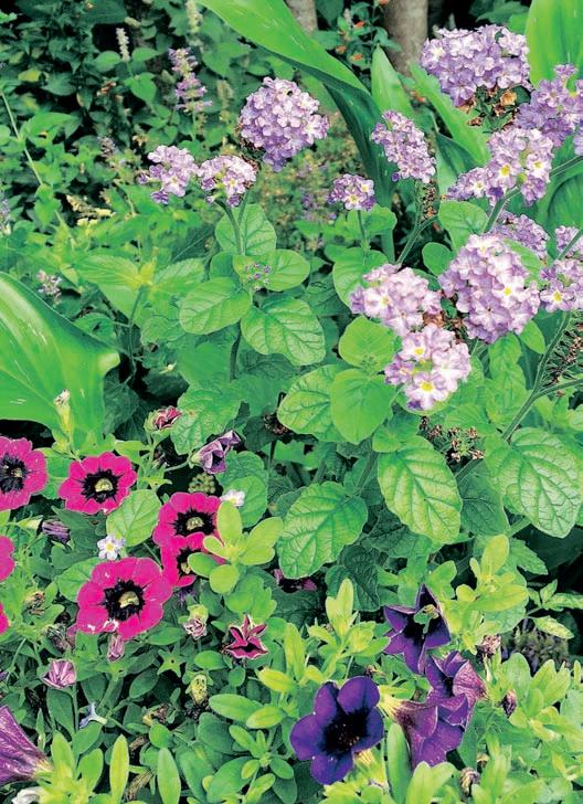 (above right) In another container, The Garden Guy combined Augusta Lavender heliotrope with Superbells Black Currant Punch with Superbells Grape Punch, both award-winning calibrachoas.