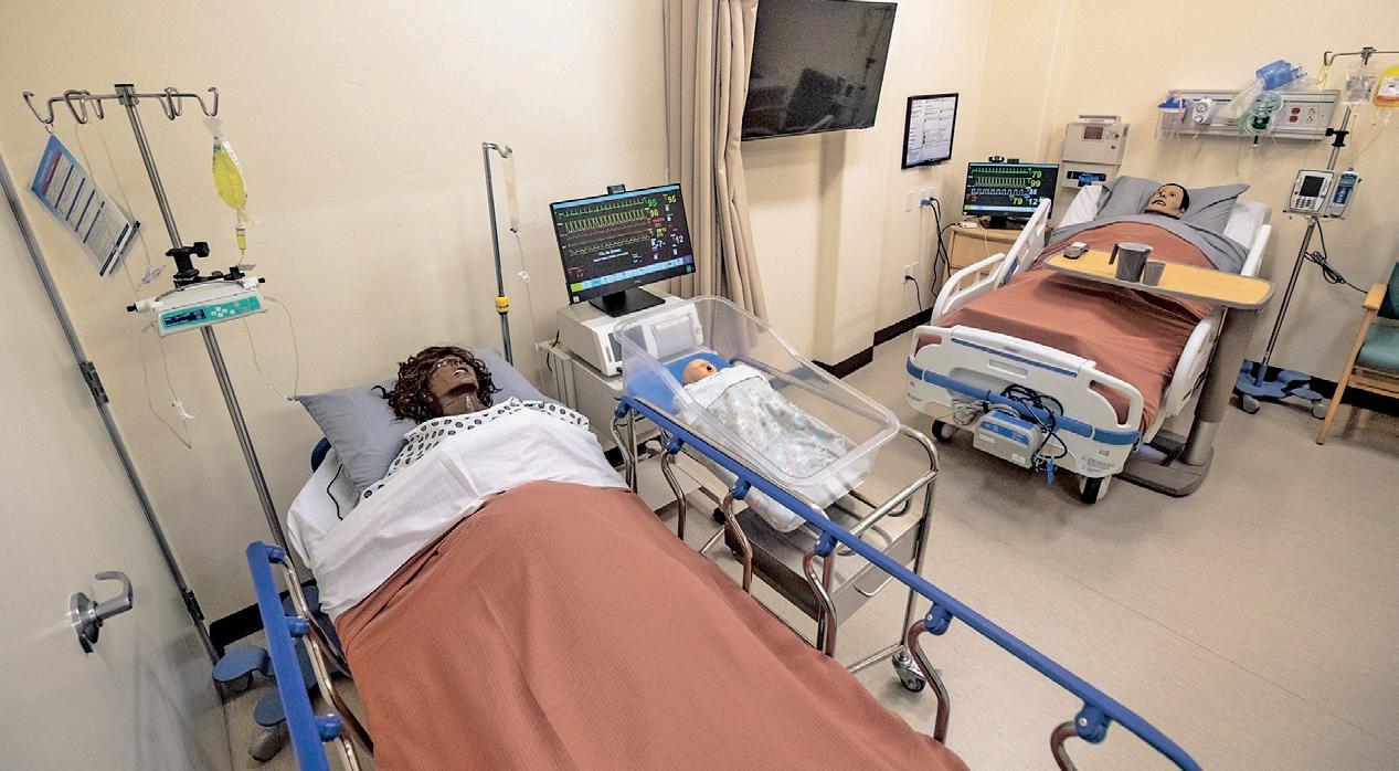 The building’s skills lab, for example, features multiple highquality, lifelike mannequins from Lifecast Body Simulation arranged in a space that replicates a hospital. Here, the nursing students will be instructed in giving head-to-toe assessments, providing patient care such as bed baths and work with IV pumps, med dispensing units and tube feeding.