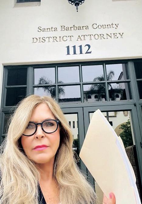 Rebecca Brand stands in front of the Santa Barbara County District Attorney’s Office. She testified Monday, reading from a written statement during part of the testimony, in the case of a homeless woman who allegedly grabbed Ms. Brand’s cellphone and struck Ms. Brand’s thigh with it.