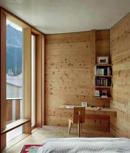 and ceilings in the bedroom are made from Swiss pine, another local building material.