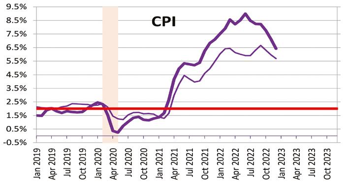 What about inflation? The overall inflation rate slowed in the second half of last year. The CPI reached a peak of 9.0% in June as the outbreak of war between Ukraine and Russia caused energy prices to soar. But as energy prices subsequently declined, the CPI slipped to 6.4%. That steady drop-off in inflation encour-