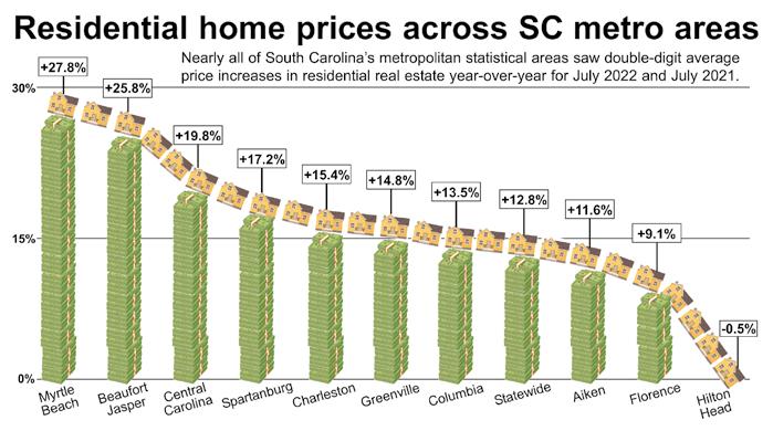Market reports from multiple listing services and Realtor associations for July show double-digit percentage increases from a year ago in nine of 11 metro areas of the state. Only Hilton Head, one of the highest-priced markets for residential property, saw a 0.50% dip in home prices, data from the Hilton Head Area Association of Realtors indicates.