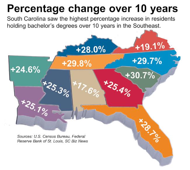 ThePalmetto State still has a way to go to catch up to states like Virginia, North Carolina and Georgia overall, but South Carolina saw the highest percentage increase of adults with bachelor’s degrees or higher than any other state in the Southeast over 10 years.
