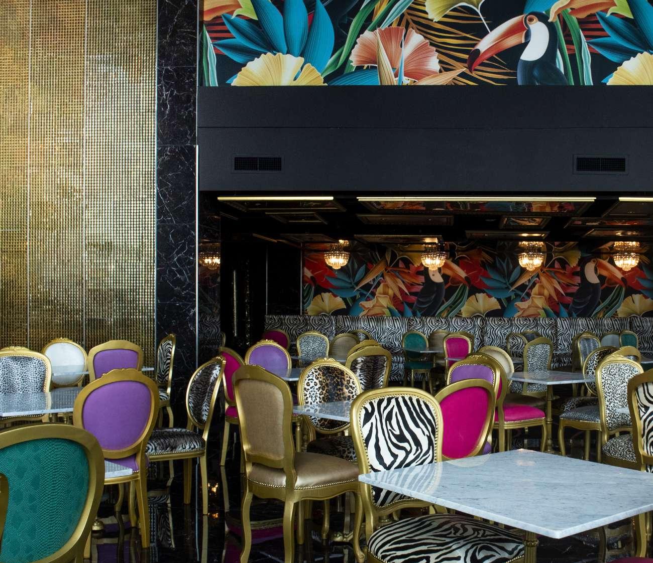 A high-rise restaurant fit for an artful city. This 165-seater, Infinity Restaurant is everything a glamorous escape atop Cape Town should be, complete with panoramic views and an interior playfully themed, afro-chic, according to the tropical wallpaper with exotic birds, mixed textures, animal print dining chairs, chic and shimmering chandeliers as well as splashes of cream, lilac and emerald green.