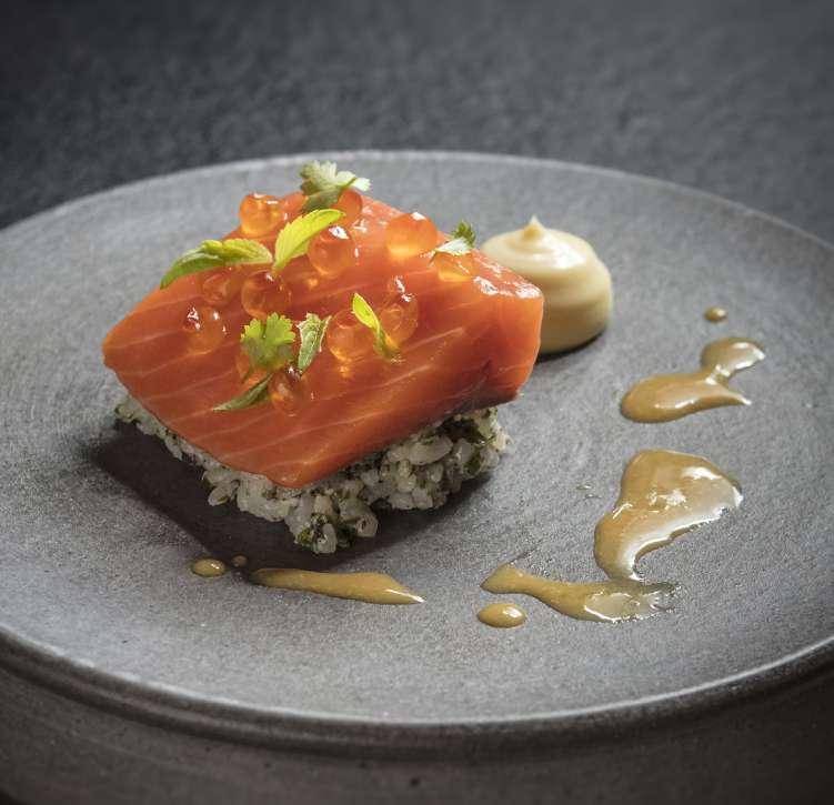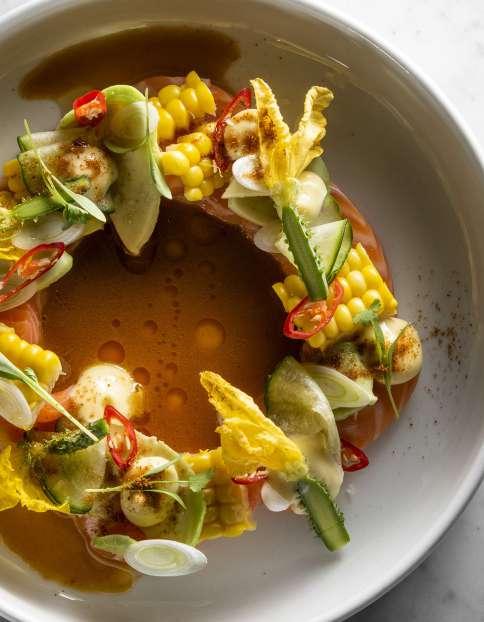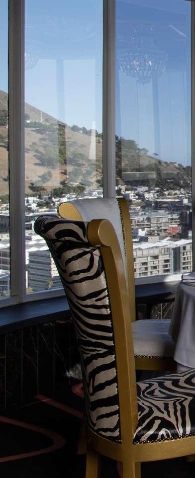 With its mirrored walls, sweeping spiral staircase, black-andwhite checkered terrazzo floors and lush tropical gardens brimming with bright hibiscus flowers, The Oyster Box hotel, located on the Umhlanga beachfront overlooking the Indian Ocean, is like stepping into another era. Go for the scene, stay for the food and drinks. Fashion and style are generously served at The Ocean Terrace, the red-and-white striped indoor-outdoor restaurant which sits adjacent to the iconic Umhlanga lighthouse. Lavishing loving attention on its pristine plates of raw and cooked seafood, this dignified Durban spot gets our vote! The menu oscillates between shellfish and raw crustaceans: Beautifully locally picked oysters served with mignonette and an American cocktail sauce, as well as ultrasophisticated recipes such as a platter of line fish, mussels and prawns in a super-luscious chardonnay cream. It’s hard to go wrong on a menu devoted to seafood and grills, but we recommend starting with the rich and decadent flamed oysters glistening with garlic butter and Parmesan. Or, let yourself be tempted by the sushi menu, which showcases artful presentation and inventive flavour combinations. The sea’s bounty is on full display on the main menu – think crumbed calamari, salmon and line fish cakes, prawns, langoustines, kingklip on the bone and West Coast sole. But the real crowdpleaser is the baby crayfish, expertly cooked with a spritz of lemon and a generous dollop of butter. The creative side dish of pea and dill rice rewards diners with a playful palate. Don’t miss out on the excellent cocktails either – the signature Umhlanga Schling made with cane spirit and cane sugar will defeat even the hottest, most humid summer evening.