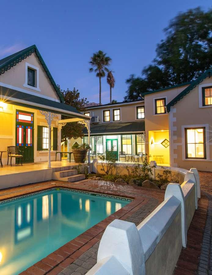 Evergreen Manor & Spa, a member of Cape Country Routes, is located in the historical core of Stellenbosch in the Western Cape. Built in 1904 Evergreen Manor & Spa invites its guests to experience friendly luxury and warm hospitality in the heart of the Cape Winelands. Evergreen offers gracious living and old-world charm combined with every modern convenience. Its spacious guest rooms are individually decorated with fine period and antique furnishings and comprise 15 en-suite Double and King/Twin Rooms. Ample relaxation space is provided by two lounges, a sun deck next to the swimming pool, and a spacious patio overlooking the garden and pool area. The intimate Evergreen Spa offers a range of wellness treatments.