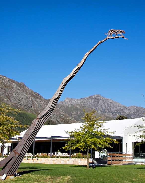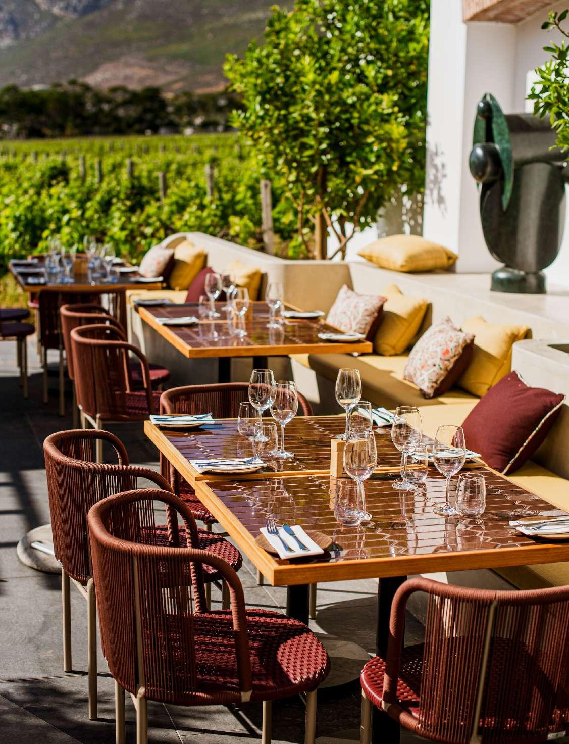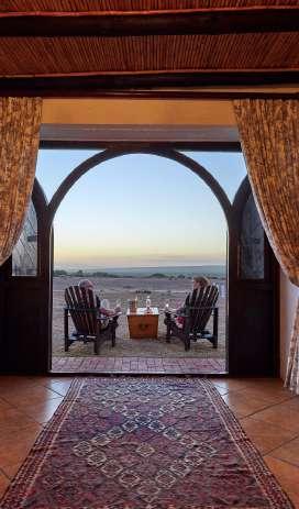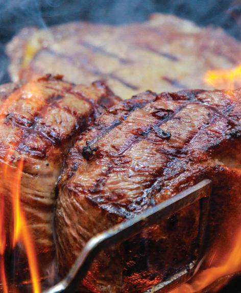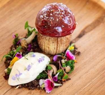 restaurant, the beating heart of Camp Figtree. Pared-back elegance is the name of the game – expect wraparound verandahs overlooking trees and lawns, leading down to a shaded sundeck and an infinity pool. We recommend that you beeline for seats on the patio and ask one of the waitresses to lead you through the extensive gin collection. There’s also an exceptional wine list and Camp Figtree’s own craft beer on tap. In summer, candle-lit suppers are warmed by the breeze from the Algoa Bay coast. The ever-changing three-course menu is short but impeccable, from countrystyle vegetable soup to roasted lamb rib eye and local cheese to finish. We particularly enjoyed the white wine garlic mussels, spring vegetable fettuccine Alfredo and sublime blueberry panna cotta. Contemporary glassware and cutlery match the lodge’s modernist tilt. Breakfast – included in the room rate, with lunch and dinner billed separately – is accompanied by frothy cappuccinos and freshly squeezed orange juice. We liked lingering over the poached eggs on a potato rosti with smoked salmon and avocado, along with seasonal fruit, granola with yoghurt and honey, croissants, soft cheeses and cured meats. Needless to say, you will not want for anything during your stay at Camp Figtree. It’s an oasis of luxury in an unforgiving landscape.