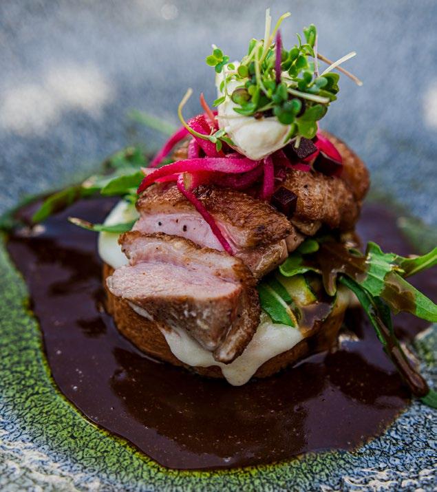 It’s such a pleasure to wander through Fairview Wine and Cheese to discover this wonderful restaurant. There’s an instant sense of comfort: We’re talking light wood, striped cushions and honey-coloured lighting set against a palette of creams and pistachio green. It opens onto a vine-covered pergola with glimpses of leafy gardens and roaming goats sheltering from the harsh midday sun. The estate bottles its share of fine wine (not least the Fairview Beryl Back flagship white), but it’s good at producing things other than grapes, too. As far as starts go, the baked camembert inside warm ciabatta with onion jam and mixed herb pesto makes the perfect shared appetiser. Although, the mustorder cheese dish is the slightly salty, crisp fingers of cheese croquettes filled with mature cheddar, mozzarella and cream cheese, paired with smoked chili sauce. The Goatshed Restaurant keeps its loyal clientele returning for more by offering generous portions and familiar-sounding dishes. A magical marriage of filling and crust makes the chicken and mushroom pie a source of joy. Sirloin steak benefits from a side of mushroom sauce, pickled vegetables and doublecooked chips. For a genuinely good plate of fresh pasta, tuck into the egg tagliatelle bursting with tomato, aubergine, courgette and capers, garnished with basil and feta. Service is polite – and country-paced. But there’s no need to rush. The baked cheesecake with its glossy, dark berry compote is more than worth lingering over.