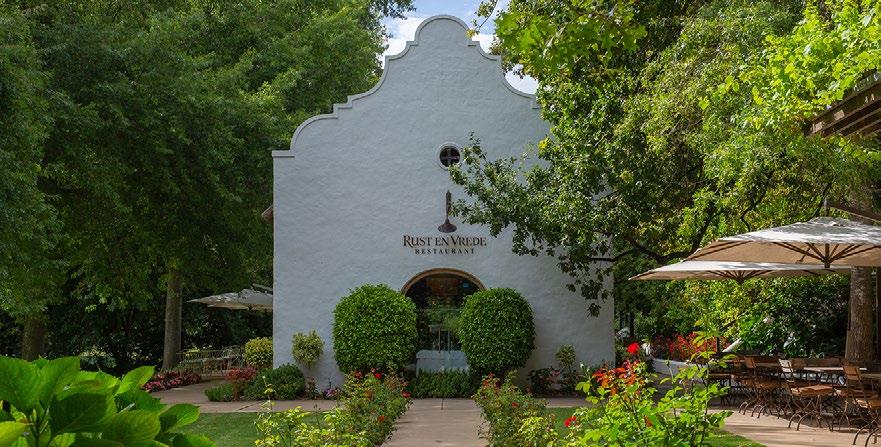 As you drive up the quiet country road leading to Rust en Vrede Wine Estate, you know you’re in for something special. From that point, you’ve entered a new world – a slower one, surrounded by ageold trees and vast gardens, and soundtracked only by glasses and cutlery clinking enthusiastically (or the occasional whir of a helicopter overhead). Even at first glance, the Rust en Vrede Tasting Room feels like a bubble of tranquility. Once inside, its rustic-chic decor only underlines that sense of calm. At lunchtime, it’s a mix of classy business lunches, intimate birthday celebrations and fashionable friends catching up over multiple bottles of outstanding red wine. Regardless of the occasion, the real draw is the Winemaker’s Lunch, served daily from 12h00 to 15h00. Fireplaces flicker through winter, but summer on the veranda is paradise. It’s all blousy heads of roses and hydrangeas, hovering over the sweep of mottled-green