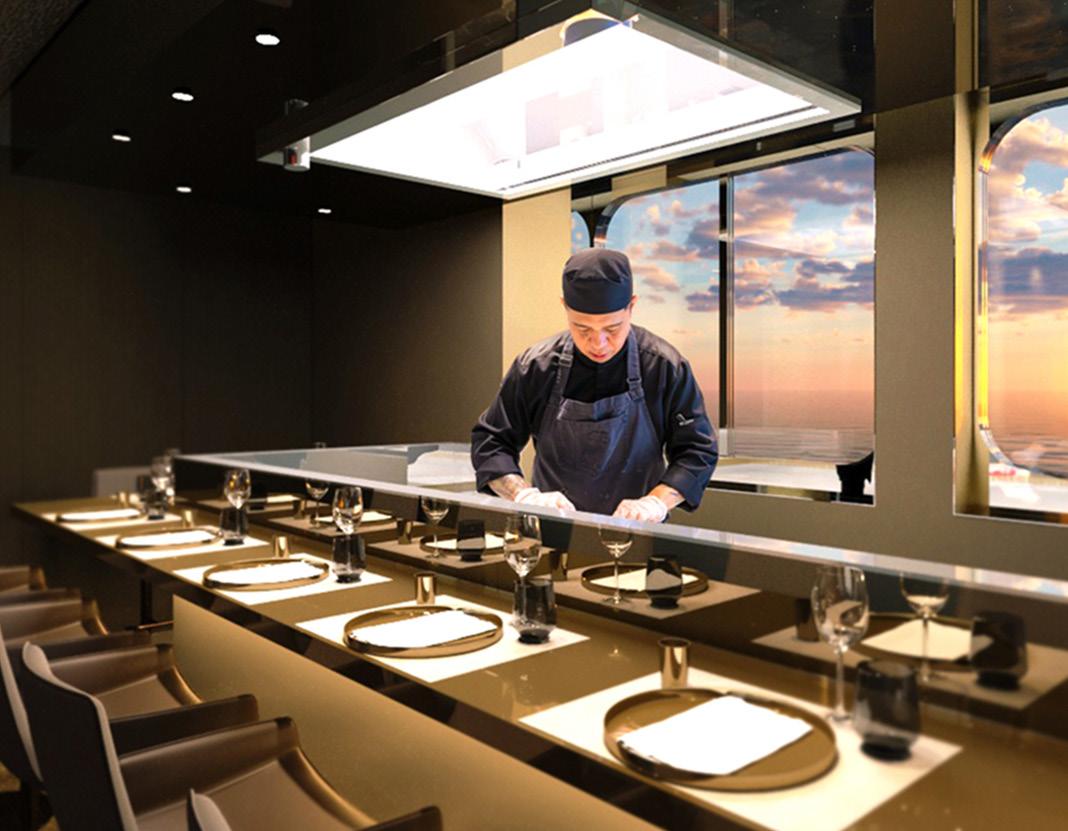 Emerald Kaia offers a new Asian style grill^ concept. This specialty private dining experience is exclusive to just eight guests and is hosted in an intimate and enclosed setting within La Cucina Dining.