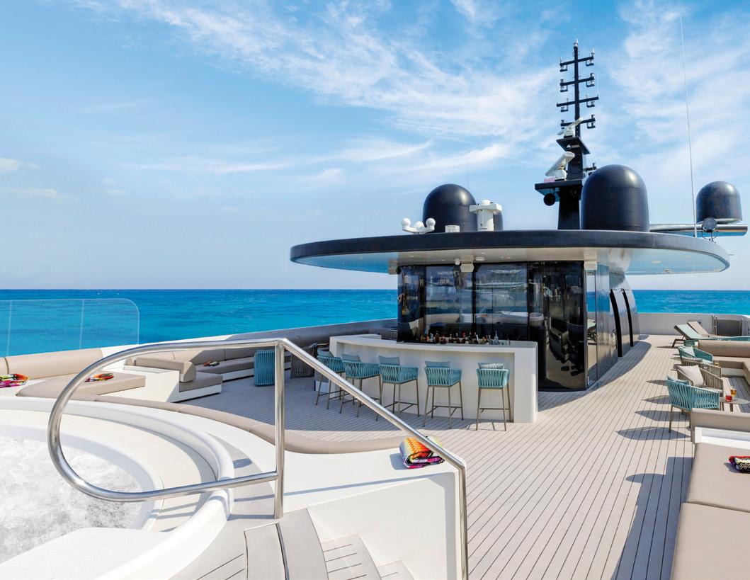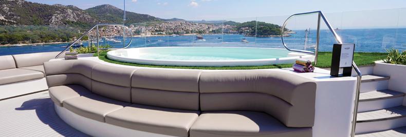 Expansive Observation Sun Deck at the bow featuring a spa pool and outdoor lounges.