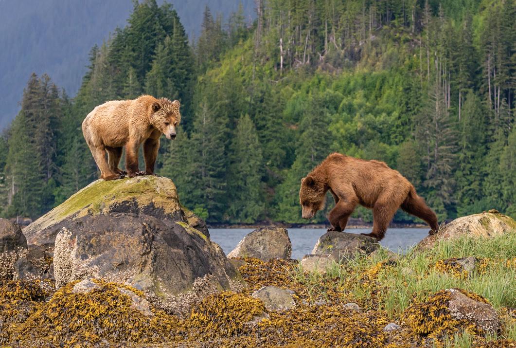 Bottom left: Two grizzly bears face off on the rugged shoreline