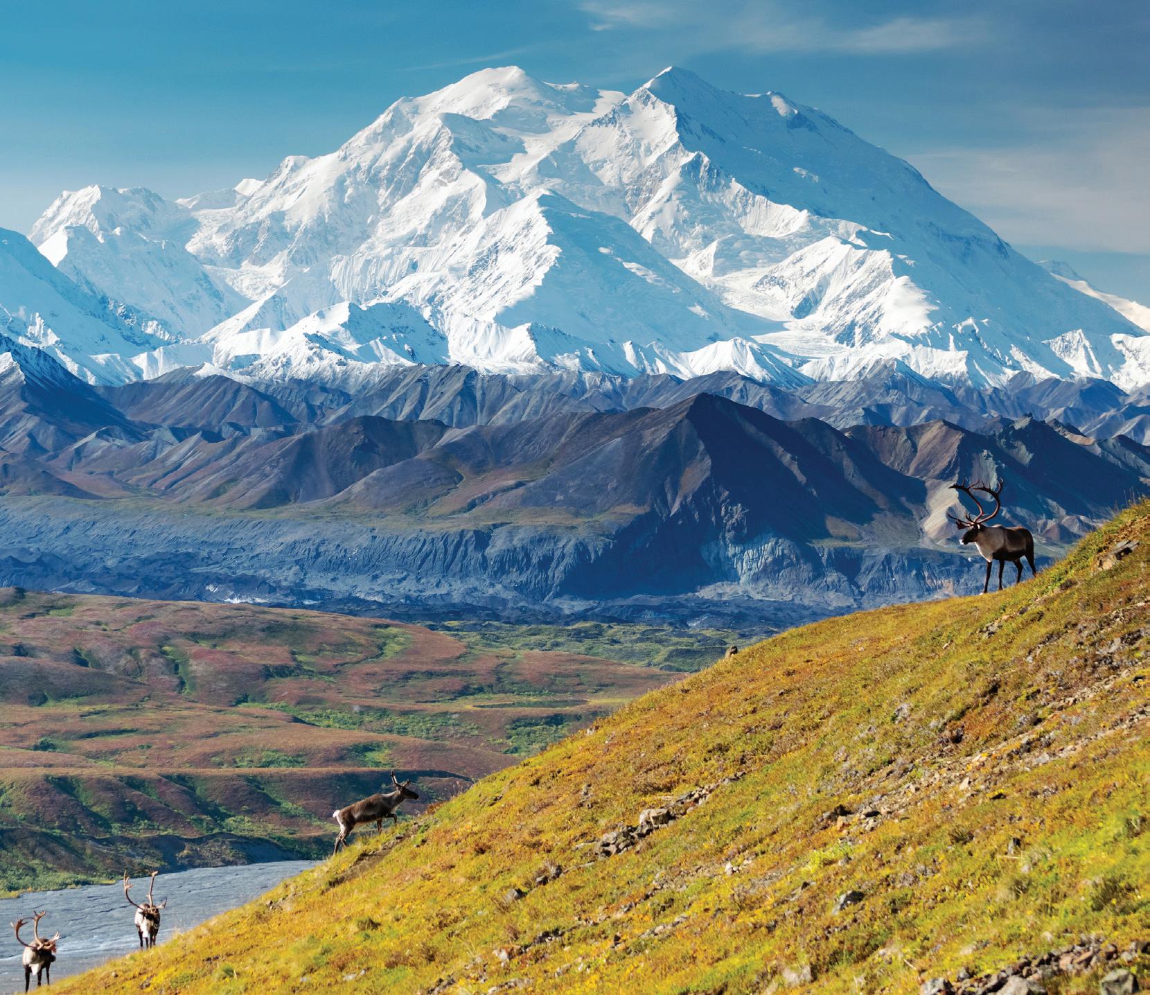 Right: Caribou deer in front of mount Denali, Denali NP, Alaska