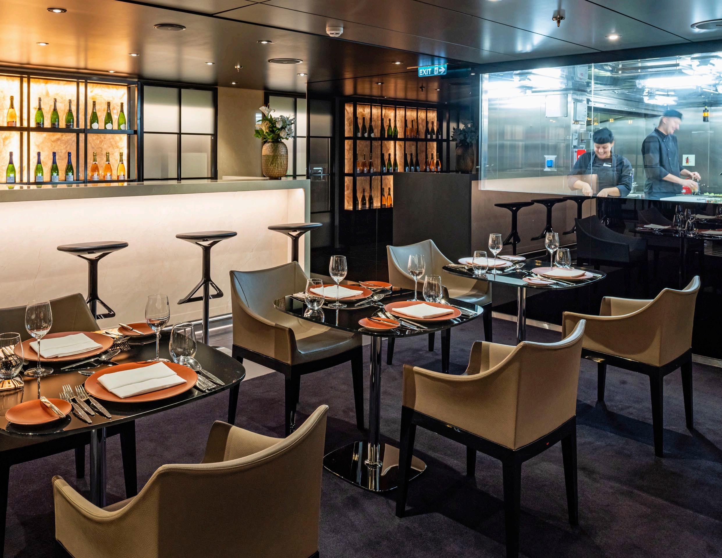Portobellos, known as L’Amour in France, is for up to 34 guests each evening. You will receive an invite to dine here once during your cruise. The five-course menu features either Italian, French or Portuguese (depending on your cruise destination in Europe) seasonal specialties, paired with elegant wines.