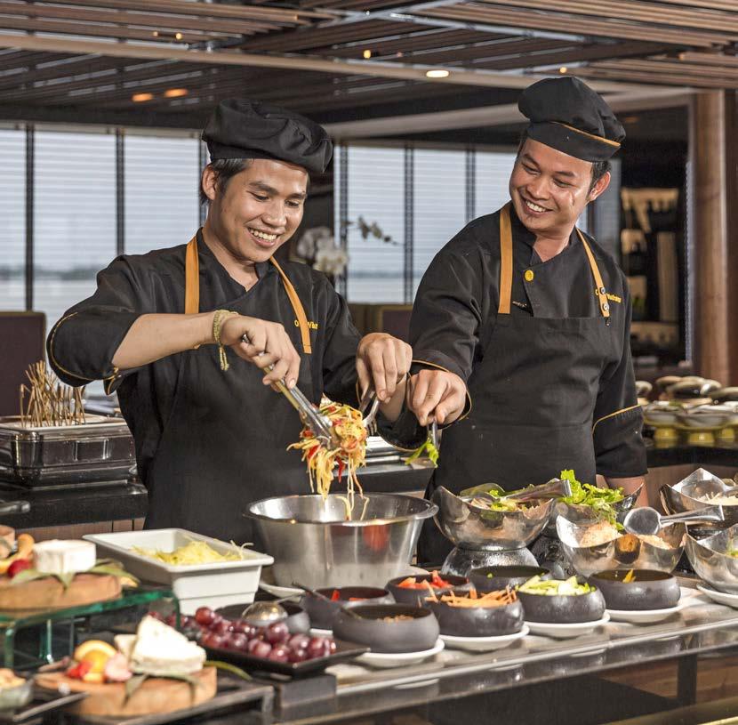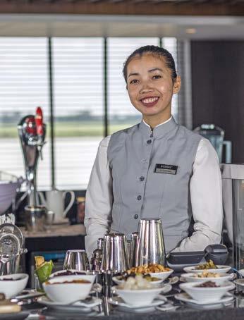 Enjoy the largest selection of included premium international beverages on the Mekong. Let your skilled mixologists create fabulous cocktails and mocktails, and for an infusion of goodness, visit the breakfast juice bar.