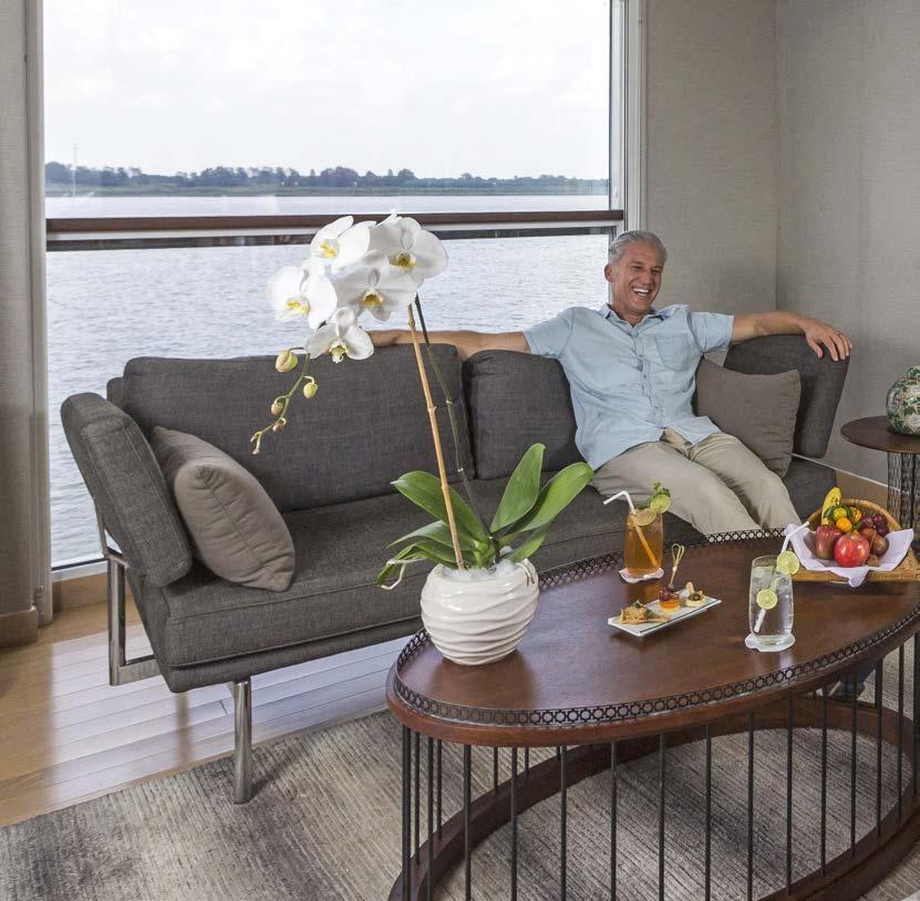 The most spacious lead-in suites available on the Mekong River, our 344ft2 Deluxe Suites feature a separate bedroom and lounge area, a Scenic Sun Lounge, elegant furnishings and a pillow menu.