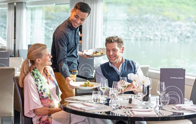 Wake to your pre-ordered coffee delivered to your suite by your butler. Make your way to the Sun Deck for stretching or head to the gym. Enjoy light refreshments from 6:30am in the Panorama Lounge; or from 7:30am, dine a la carte or from the live buffet in Crystal Dining.