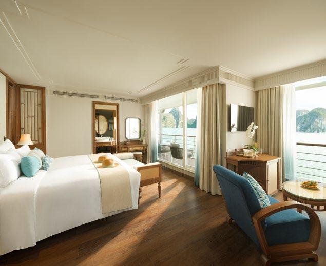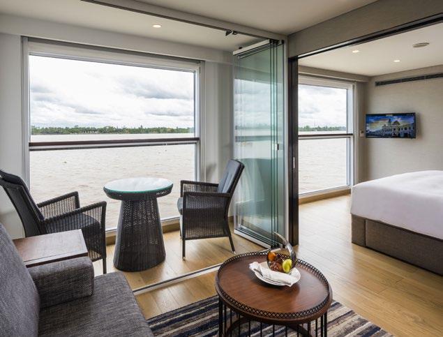 The most spacious lead-in suites available on the Mekong River, the 32m2 Deluxe Suites feature a separate bedroom and lounge area, walk in wardrobe, Scenic Sun Lounge, elegant furnishings and a pillow menu.