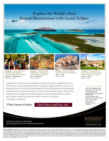 For more information visit scenicusa.com *All drinks on board are included except for a very small number of rare, fine and vintage wines, Champagne and spirits. ^Limited in remote regions. #Spa treatments at additional cost. Kayak and stand-up paddleboard not available in all locations.