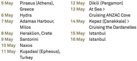 Experience 5 Greek islands, Turkey’s historic ports, ANZAC Cove and an overnight in vibrant Istanbul on this landmark voyage.