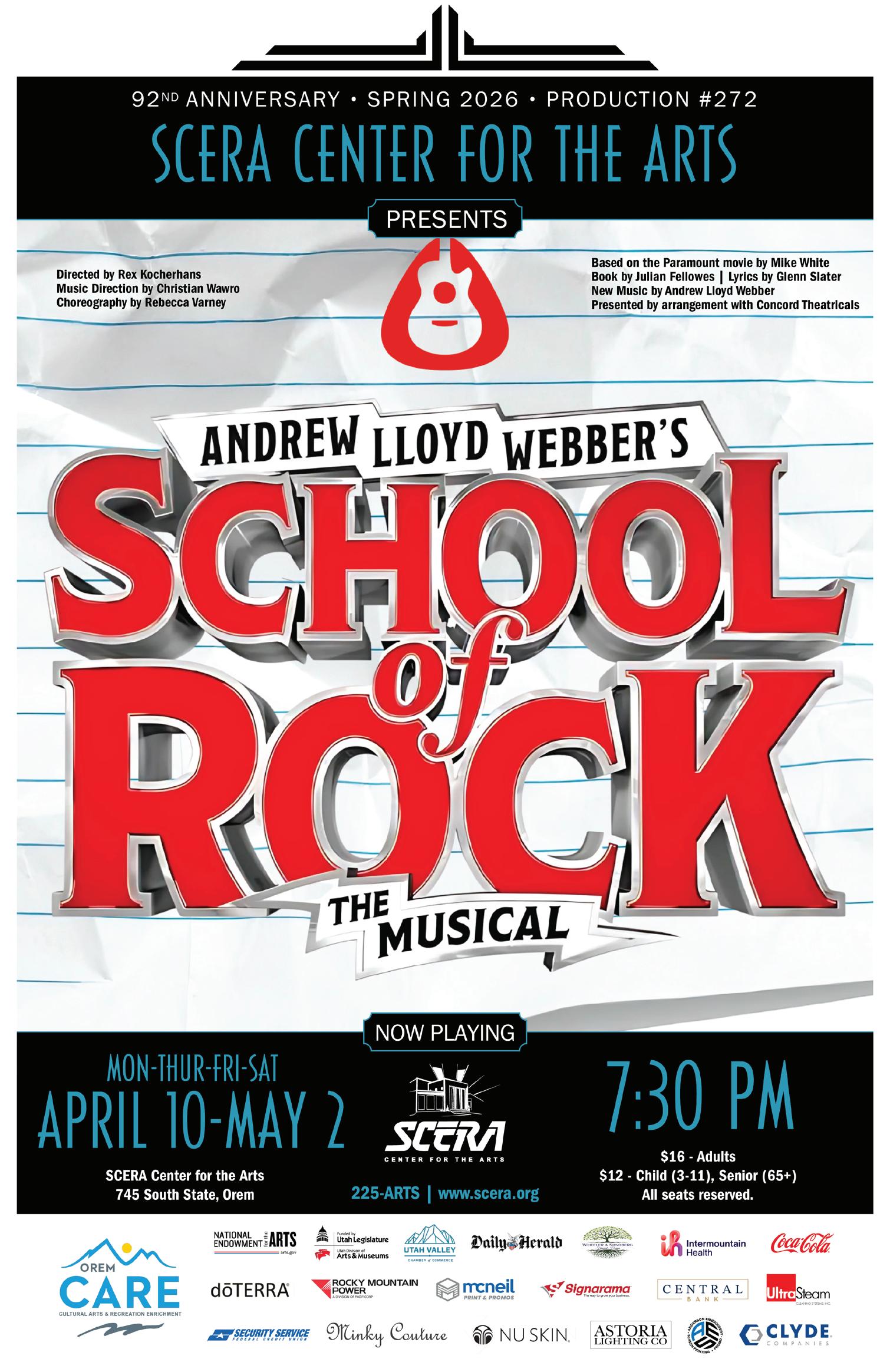 (Choreographer) Rebecca is thrilled to have been able to choreograph School of Rock. Recent credits include Crazy for You and Mary Poppins at the SCERA Shell, Wizard of Oz at SCERA Center for the Arts, and Newsies at Lehi Arts Center. She currently serves as the Dance Education Director and Volunteer Coordinator at SCERA. She is grateful for the support of her friends and family and her son, Banks, as well as the talented cast. She is also incredibly grateful for Rex, Christian, and Alathia who have been amazing to work with. Rebecca invites you to enjoy the show and thanks you for supporting the arts!