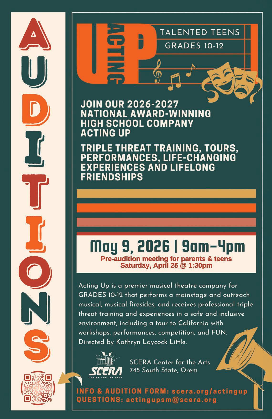 men's acapella quartet Reprise, which won the Gold Medal at the international collegiate barbershop competition and has shared the stage with the King’s Singers. He performed in Europe, West Africa, Australia, New Zealand, and the Middle East with the BYU Singers, including concerts at the Sydney Opera House and Carnegie Hall. He has studied with Betty Jeane Chipman and Rebecca Wilberg, and his voice can be heard on numerous TV, video game, and film projects. Rex grew up performing on stages at SCERA and is thrilled to be back directing at this place that feels like home!