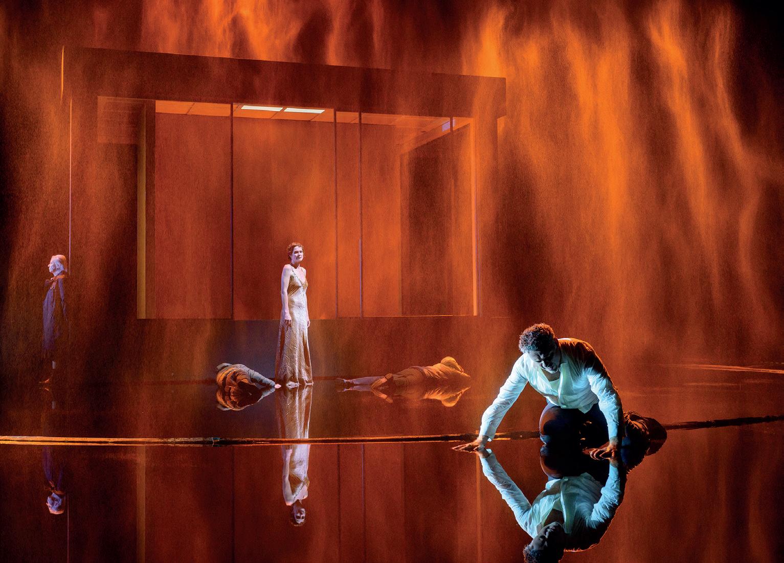 Jason erstarrt. In seinem Rücken steht Medea zwischen ihren Söhnen, die reglos im Wasser liegen. Sie blickt zu ihm. Das rote Licht bricht sich im feinen Sprühregen, so dass der Eindruck von lodernden Flammen entsteht, die sich über Medea und ihre Söhne ergießen.