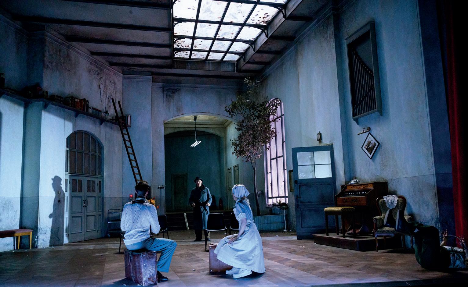 Der Vorhang öffnet sich. Elwood läuft durch das düstere Empfangszimmer des Sanatoriums. In der Mitte stehen in einer Reihe zwei mal zwei Stühle. Die Eingangstür ist offen, Freuds Porträt über der Orgel hängt schief.