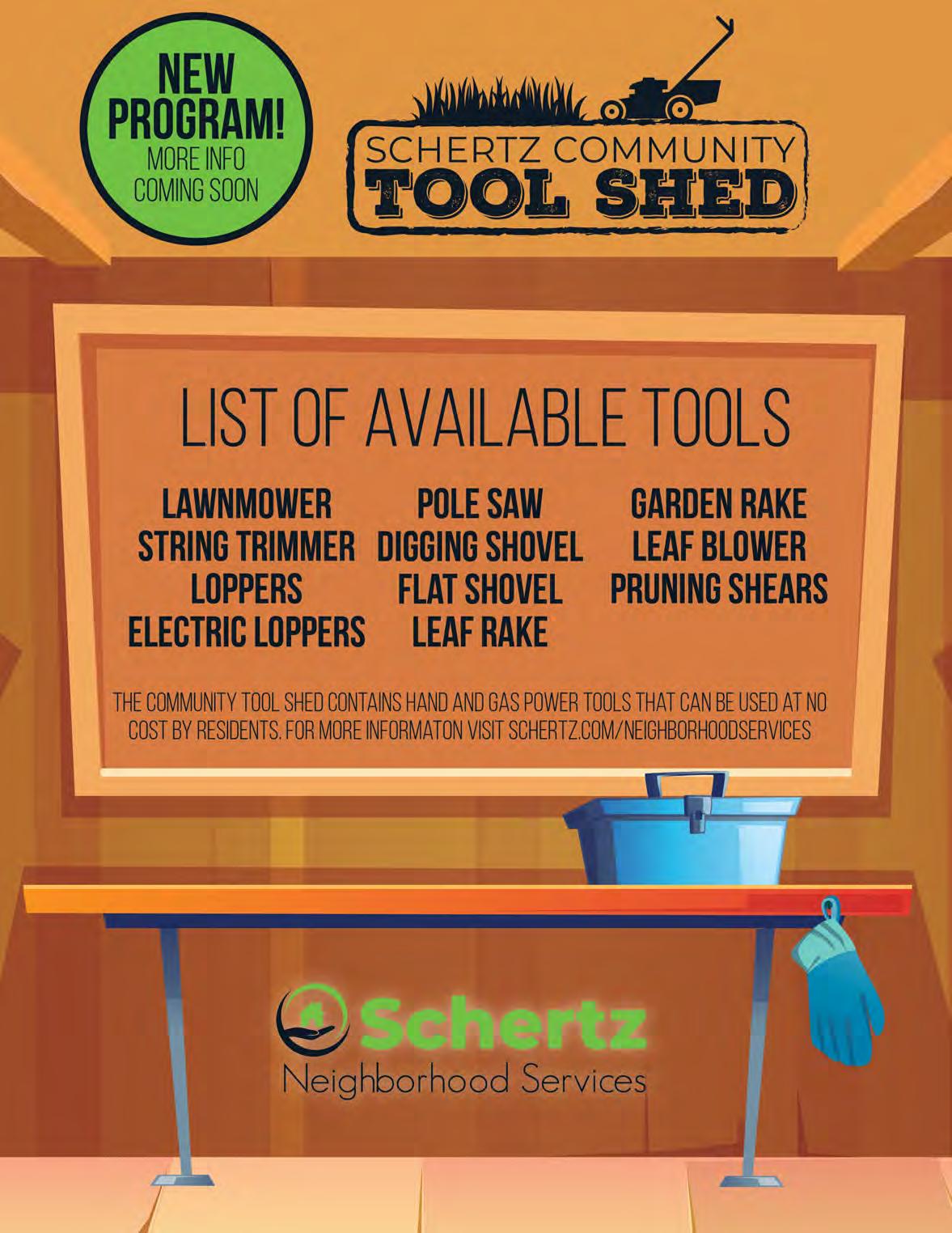 Additionally, there is interesting information on a new program called the “Schertz Community Tool Shed” in which we will make tools available for checkout if citizens need them for yard work and small repair jobs. We hope this will be a great value for residents!