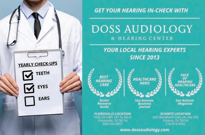 Risk-free trial on Oticon technology Personalized hearing screening Otoscopic video examination of ear canal Schedule your FREE hearing consultation! 1919 Oakwell Farms Pkwy #254 San Antonio, TX 78218 1996 Schertz Pkwy #104 Schertz, TX 78154 SCHERTZ SAN ANTONIO Call Today! (210) 268-8229 2 / SCHERTZ MAGAZINE July 2023