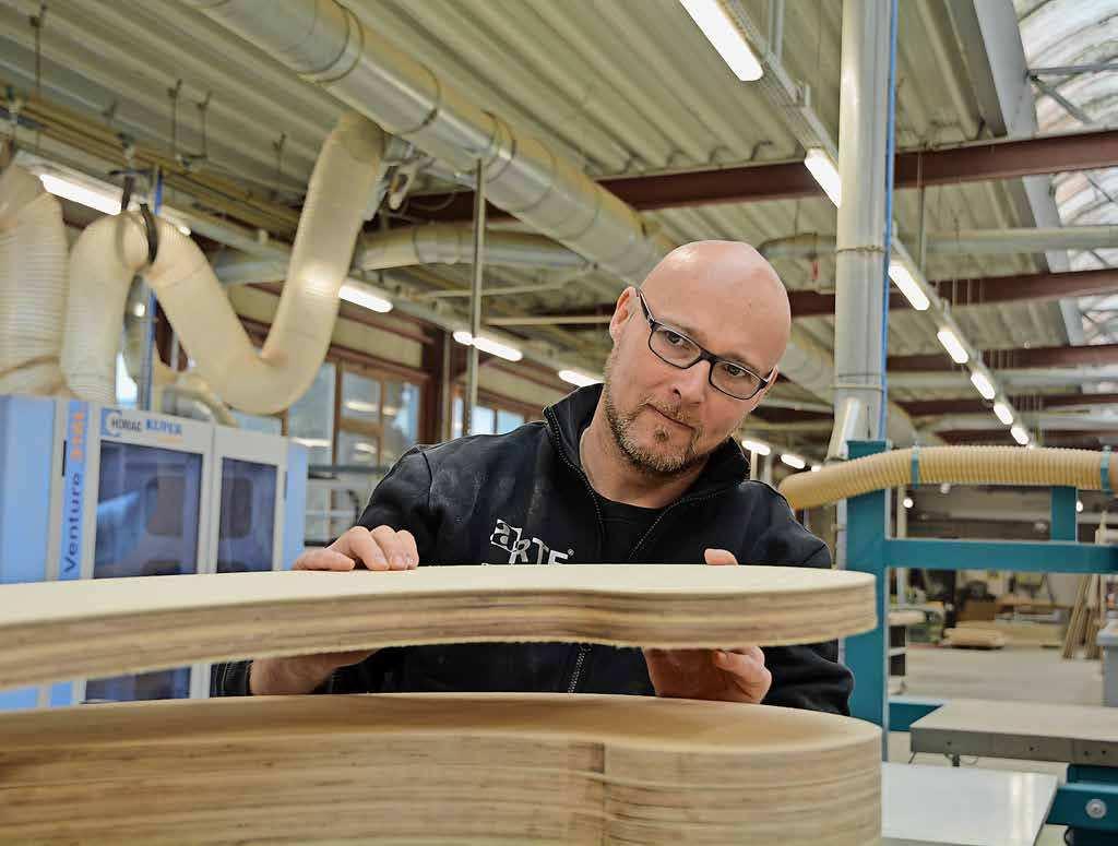 Ein Schreibtisch ist auch offiziell sein Arbeitsplatz bei aRTE Möbel. Dort erledigt er Planungsaufgaben und den Einkauf. Viel Zeit verbringt er auch (noch) in der Werkstatt. Dass er kein gelernter Tischler ist, ließ er während der Meisterschule nur die wenigsten wissen. Umso mehr Respekt erhielt er nach dem erfolgreichen Abschluss. ANJA GILDEMEISTER W