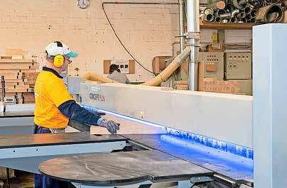 Schnell, sicher und staubarm werden Teile mit der Druckbalken-Formatkreissäge zugeschnitten.