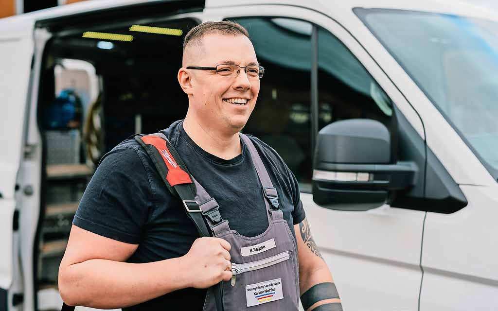 1988 in Osterburg geboren und in Seehausen/ Stendal aufgewachsen, wagte er nach seinem Realschulabschluss zunächst einen Ausflug in den sozialen Bereich. Doch es war die Begeisterung eines Freundes für das Handwerk, die ihn schließlich zum Beruf des Heizungsbauers führte. Seine Ausbildung absolvierte er bei Wärmetechnik Peter Liestmann in Stendal – eine prägende Zeit: „Er war sehr fordernd, aber auch der Beste im Landkreis. Er hat mich fürs Leben geprägt“, sagt Martin Raguse. Die 2000er-Jahre waren für Handwerker nicht leicht, sodass er nach seinem Gesellenabschluss zunächst in der Industrie arbeitete, um sich seinen Traum von Haus und Familie zu erfüllen. Doch mit der Zeit wurde ihm klar: „In der Industrie bist du nur eine Nummer.“ Die Leidenschaft fürs Handwerk ließ ihn nicht los – er kehrte zurück und arbeitete als Kundendienstmonteur. Eine Verletzung beim Kraftsport und mehrere Bandscheiben-Operationen stellten seine Zukunft infrage. Doch durch den Rententräger eröffnete sich eine neue Perspektive: die Möglichkeit, die Meister-