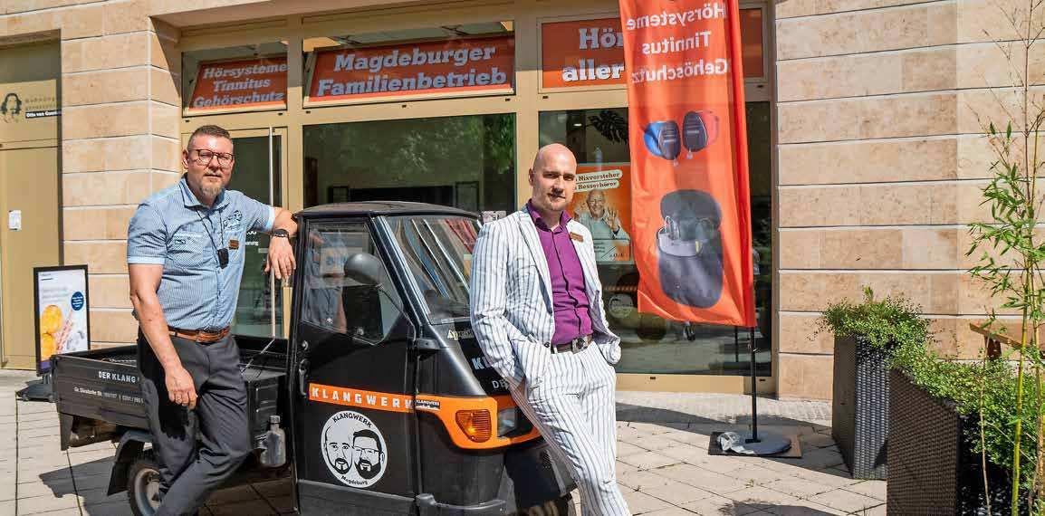 Magdeburg, Breiter Weg, der Dom ist nur einen Häuserblock entfernt. Stefan Reimann steht in der Sonne vor seinem Laden und telefoniert mit einem Knopf im Ohr. Kein ungewöhnliches Bild in Zeiten von In-Ear-Geräten wie Airpods und Co. Doch etwas ist anders. Reimann telefoniert über sein Hörgerät. „Ich kann telefonieren, Musik oder Podcasts hören –und das sogar in top Qualität beim Motorradfahren“, sagt er. Für den Hörgeräteakustikermeister gehört die Bluetooth-Funktion zu den bisher wichtigsten Komfort-Entwicklungen seiner Branche. Stefan Reimann und Sebastian Heeger haben vor vier Jahren das Unternehmen Klangwerk in Magdeburg gegründet. Der Geschäftsansatz der beiden Hörgeräteakustikermeister ist es, den Kunden in wohnlicher Atmosphäre mit neuester Technik und hohem Beratungsaufwand Lust auf die vielseitigen Helfer zu machen. Denn eines sei klar: „Anfangs hat niemand Bock auf ein Hörgerät“, sagt Sebastian Heeger. „Das wandelt sich erst, wenn die Kunden sie ausprobieren und die Möglichkeiten kennenlernen.“