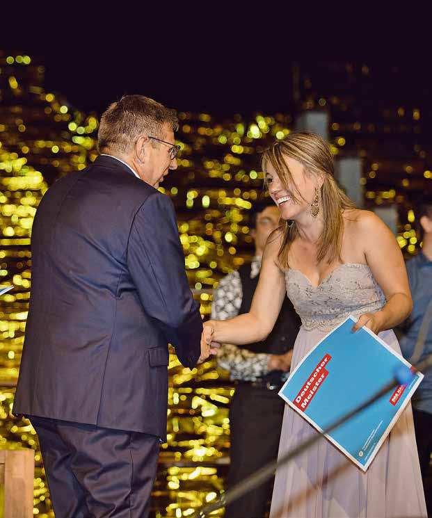 Der Höhepunkt des Abends war die feierliche Übergabe der Meisterbriefe an 212 Jungmeisterinnen und Jungmeister des Handwerks aus insgesamt elf Gewerken. Zu jedem einzelnen Gewerk gab es vor der Übergabe der Briefe durch Präsident Roman ein passendes Kurzvideo (S.12). Das letzte Wort des Abends hatte Jan Fischer aus Bockenem, Mau rer- und Betonbauermeister, der im Namen seines Jahrgangs die zurückliegende Zeit zusammenfasste. „Die Meisterschule war eine intensive Zeit für uns alle. Den Meistertitel bekommt man eben nicht geschenkt. Und das ist absolut richtig so. Ein Meis terbetrieb hat mal eben locker die Verantwortung für ein halbes Dorf – denn an den Arbeitsplätzen hängen Kaufkraft, Steuern, Sozialversicherungen und ganze Existenzen“, so Fischer. Den Abschluss der Veranstaltung bildeten dann noch einmal alle frischgebackenen Meisterinnen und Meister des Abends gemeinsam auf der Bühne, die sich unter den Klängen der bestens aufgelegten Music Unli