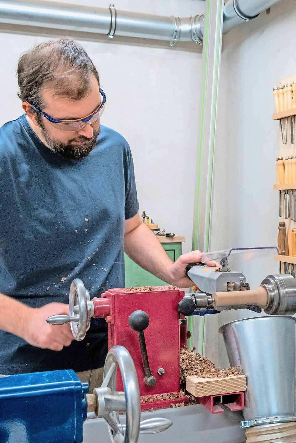 Für das Handwerk in eine neue Heimat Zum Drechslerhandwerk kam Fenner über Umwege. „Nach der Schule bin ich für fünf Jahre in den Rettungsdienst gegangen“, berichtet der 37-Jährige. Es folgten Stationen als Lkw-Fahrer, Bäcker und Baumaschinenführer. Seine Erfüllung fand er nicht. „In meiner Familie hatten viele etwas mit Holz gemacht. So kam ich zum Drechslerhandwerk.“ 2016 hat er seinen Betrieb in Vollzeit gegründet. Auf Arbeiten für Tischlereien folgte die Spezialisierung auf Werkzeug. Angefangen hat er in seiner Heimat zwischen Wuppertal und Düsseldorf. 2019 dann der Schock: Als das Dorf Flandersbach in ein reines Wohnquartier umgewandelt werden sollte, seien Unternehmen systematisch vergrämt worden. Bundesweit suchte er eine neue Werkstatt. Der Landkreis Lüchow-Dannenberg war der erste, der ihm den Weg bereiten wollte. „Anfang April 2020 wurde die Bauanfrage beschieden, dann habe ich gekauft und bin im Mai umgezogen“, erinnert sich Fenner. Bis das Bauamt sicher war, dass er die denkmalgeschützte Scheune zu einer nutzbaren Werkstatt herrichten durfte, vergingen allerdings doch Monate der Unsicherheit. „Die Handwerkskammer Braunschweig-Lüneburg-Stade hat mich dabei unermüdlich unterstützt und mir viel Arbeit mit den Behörden abgenommen“, lobt der Handwerker.