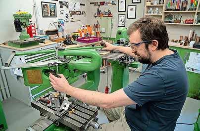 Lager. Häufig verwendet er Nussbaum. „Der ist bei uns handverlesen von einem kleinen Händler aus Süddeutschland.“ Das Holz stamme von wildwachsenden Bäumen frei von forstwirtschaftlicher Geradlinigkeit. Das sorge für eine einzigartige Maserung. Eine Bohrahle zum Vorbohren von Schraub- und Nagellöchern entsteht zum Beispiel in folgenden Schritten: Erst dreht Fenner das Heft vor. Dann wird die Zwinge aus Messing, Titan oder Neusilber angefertigt und eingepasst. Das montierte Heft wird dann noch einmal fein überdreht und geschliffen. Und was hat es mit dem 3D-Drucker auf sich? Den verwendet der Drechsler einmal, um Kopierschablonen seiner Heftformen für die Kopierdrehmaschine