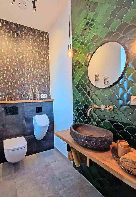 Fliesenlegermeister Heiner Götting hat Anfragen von Kunden, die „mehr als außergwöhnlich“ sind. „Diese Schuppenfliesen gehören dazu“, sagt der Inhaber von Fliesen Götting in Bösel. Denn: „Sowohl die Farbe als auch die Form haben etwas Besonderes.“ In Spanien habe er die Fliesen ausfindig gemacht und seiner Frau den Wunsch erfüllt, die grünen Schuppen im Bad anzubringen. „Es brauchte mehrere Anläufe. Mit der Form zu arbeiten, war ganz neu für uns“, sagt Götting. Der Abschluss zur Tapete sei nur mit einer speziellen Schiene möglich gewesen. Entstanden ist ein Fliesenspiegel über dem Waschbecken aus Naturstein, das auf einem Waschtisch aus Eiche steht. Ein Wasserhahn aus Messing, direkt aus der Wand, rundet das Bild ab. (JA)