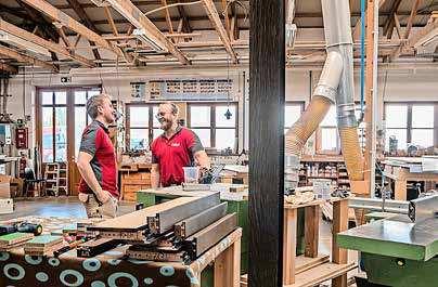 Weiter geht es bei Beratungsgesprächen in der Schreinerei. „Ich wollte einen sauberen schönen Raum haben, in dem man mit Kunden spricht, wo man sich gemütlich hinsetzen, einen Kaffee trinken und sich unsere Arbeiten angucken kann“, sagt Engelhardt. Dafür hat er 2014 seine Ausstellung am Firmensitz eingerichtet.