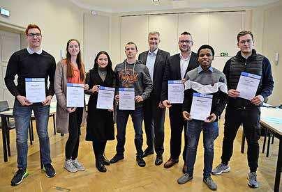 Hauptgeschäftsführer Burghard Grupe überreichte am 2. März Stipendien an diese jungen Leute. tal Malatova (Genthin), Augenoptiker Alexander Möbius (Schönhausen), Straßenbauerin Jargalmaa Rentsendorj (Genthin), Tischler Sascha Langwald (Pollitz), Maurer Nick Soltau (Magdeburg) (AG)