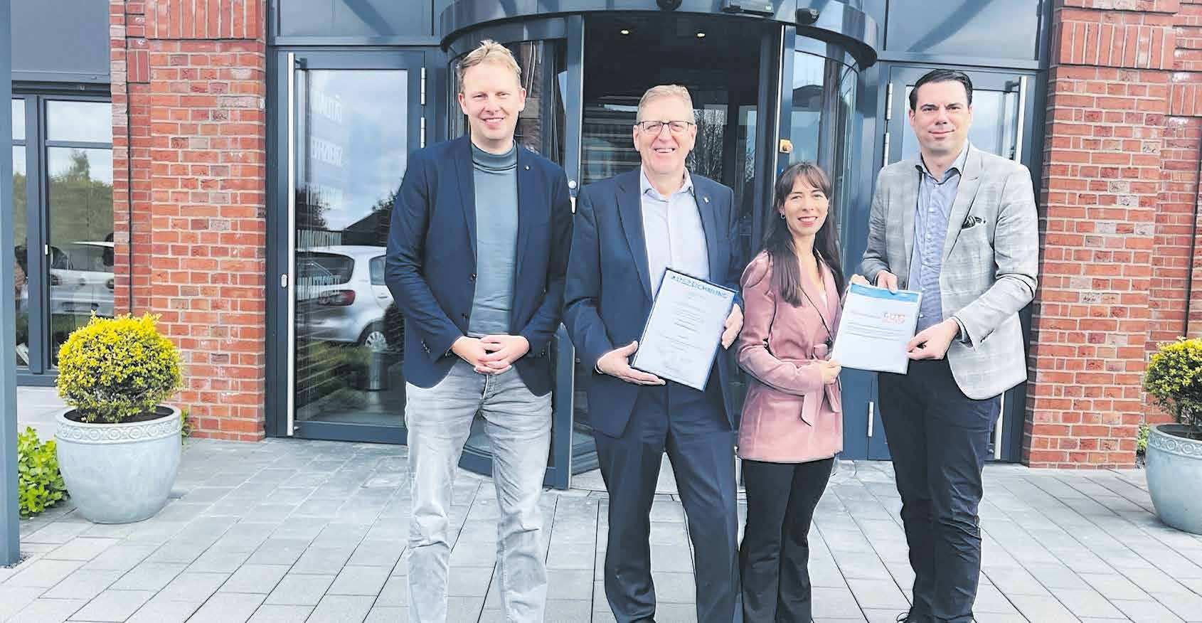 Sprachen über die Geschäftslage im regionalen Handwerk (v.li.): Heiko Henke, Hauptgeschäftsführer der Handwerkskammer, Lukas und Dieter Melle von der Maschinenbau- und Landtechnik-Firma Melle aus Goldenstedt, Kammerpräsident Eckhard Stein und Michael Metzler, betriebswirtschaftlicher Berater der Handwerkskammer.