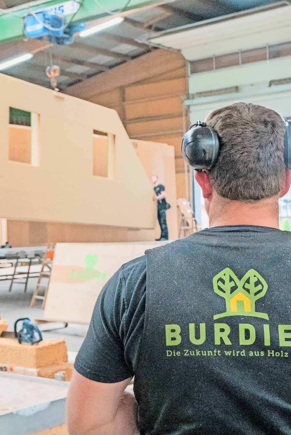 Von der Planung bis zum Zuschnitt setzen die Handwerker voll auf Digitalisierung. „Wir zeichnen unsere Häuser digital und können unseren Kunden nahezu fotorealistische Entwürfe zeigen“, sagt Burdiek. In der Konstruktionsphase werde das komplette Haus durchgeplant: Wände, Decken, Ausschnitte für Fenster und Türen; selbst die Positionen von Steckdosen und Heizungsleitungen könnten dabei bedacht werden. In der Fertigung geht es digital weiter. Erst im vergangenen Jahr hat der Betrieb in eine neue Abbundanlage investiert. Ausgestattet mit einem Sechs-AchsRoboterarm zum Fräsen und Bohren und einem zusätzlichen Arm mit 800-Millimeter-Sägeblatt, können die Handwerker ihr Konstruktionsvollholz (KVH) auf Knopfdruck komplett gemäß den digitalen Konstruktionsvorgaben bearbeiten. Danach wird das Holz von der Abbund- in die Montagehalle gefahren. Hier verarbeitet das Team es zu kompletten Wandmodulen weiter. Die Zimmerer realisieren das KVH-Holzständerwerk direkt inklusive Wärmedämmung. Die äußere Schicht zur Aufnahme der Fassade bilden Holzweichfaserplatten. Auch Fenster baut der Betrieb häufig schon in der Halle ein. Dann geht es auf einem Tieflader zur Baustelle. „Wir wollen so viele Arbeiten wie möglich bereits hier in der Halle abschließen. Das reduziert Fahrtkosten und Rüstzeiten auf der Baustelle, verbessert unsere Auslastung und macht uns wetterunabhängiger“, sagt Burdiek. Seit 2015 bildet der Holzhausbau den Geschäftsschwerpunkt der Zimmerer. „Wenig später hat das Thema mit der Fridays-for-Future-Bewegung noch zusätzlichen Aufwind bekommen“, verrät Burdiek. Der Unternehmer legt Wert darauf, dass seine Häuser Nachhaltigkeitsansprüchen in mehrfacher Hinsicht