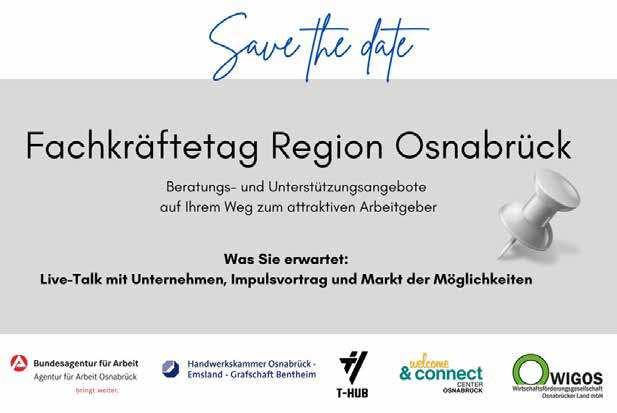 Den Fachkräftetag gestalten unter anderem: Die Wirtschaftsförderung des Landkreises und der Stadt Osnabrück, die Agentur für Arbeit, die Handwerkskammer, das T-Hub Osnabrück und das Welcome & Connect Center Osnabrück. ANDREAS LEHR W