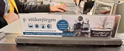 Oft sind die Warentrenner an der Supermarktkasse schmal und unauffällig. Doch das geht auch anders, wie wir in einem Supermarkt in Ostwestfalen gesehen haben: Dort tragen die Trenner die Werbung örtlicher Betriebe. So erfahren Kunden zum Beispiel, dass der SHK-Betrieb P. Stükerjürgen aus Rietberg „individuelle Heizsysteme“ anbietet. Andere werben für einen Zweiradhändler, einen Baustoffhandel und auch für Ferienwohnungen. Die Warentrenner sind deutlich größer, individuell gestaltet und wecken so Aufmerksamkeit bei wartenden Supermarktkunden. Wer Interesse hat, kann gleich auf die Kontaktdaten des jeweiligen Betriebs zugreifen. (AML)