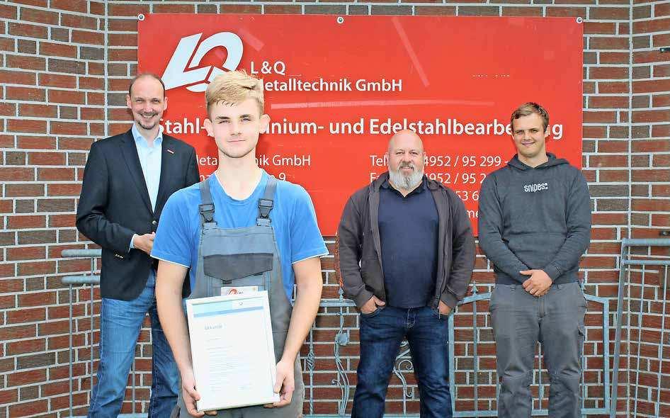 Dirk Bleeker (v.l.) besuchte Azubi Lukas Schwede, Ausbilder Anders Laaken und Kollege Robin Janssen im Betrieb L&Q Metalltechnik.