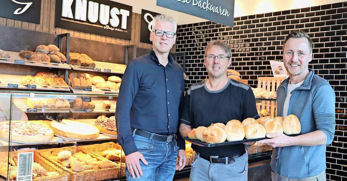 Am Verkaufstresen der Bäckerei Grünhoff zeigen sie die neuen TK-Brötchen (von links): Thomas Harms, Lars Grünhoff und Produktionsleiter Michael Haase.