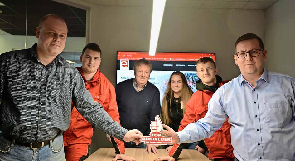 Verantwortung ist das Geheimrezept Dass die E-Service Haberkorn GmbH in Harzgerode ein guter Ausbildungsbetrieb ist, hat sich herumgesprochen in der Region. Antonia Kinder, angehende Kauffrau für Büromanagement im ersten Lehrjahr, bekam die Empfehlung von Familie und Freunden. Auch Julius Küsters und Stephan Müller, beide Elektroniker für Gebäudesystemintegration im zweiten Lehrjahr, folgten dem guten Ruf der Firma. „Das ist ein Zeichen für ein gewachsenes Unternehmen“, freut sich Geschäftsführer Uwe Haberkorn, der den Betrieb im Jahr 2002 gründete und heute mit seinem Sohn Thomas Haberkorn sowie Martin Wagner führt. 70 Mitarbeiter sind aktuell angestellt, damit ist E-Service Haberkorn das größte Unternehmen dieser Art in der Region. Drei Geschäftsfelder werden beackert: die Elektroinstallation, die Photovoltaik und der Service. Die Azubis lernen die große Bandbreite des Elektro-Handwerks kennen: neben der Elektroinstallation etwa die Datennetzwerk-, die Antennen-, die Beleuchtungs- und die Anlagenmesstechnik; neben der Photovoltaik auch Speichersysteme und Ladesäulen; außerdem alle dazugehörigen Service-Dienstleistungen und darüber hinaus noch den sogenannten After-Sales-Service für Photovoltaik-Hersteller, also die technische Betreuung der