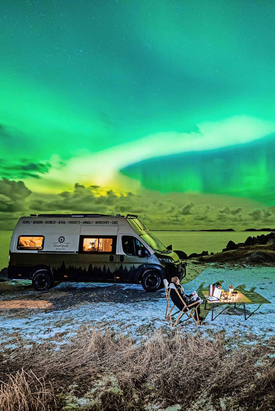 Festgesetzt irgendwo im Nirgendwo, die Straße ist gesperrt, die Sichtweite beträgt keine fünf Meter. Nur wenige Zentimeter Karosserieblech plus Innenverkleidung trennen Tomke und Jakob Prößdorf vom draußen tobenden Schneesturm. Etwas unbeständig sei das Wetter kurz vorm Nordkap – vor Kurzem habe hier noch die Sonne geschienen. Geduldig harrt das Ehepaar mit seinen beiden Labradors in seinem Camper auf sieben Quadratmetern aus. Immerhin: Die mobile Internetverbindung ist tadellos. Lust auf ein Interview heute per Video-Chat? „Klar“, sagt Jakob Prößdorf spontan. Spontaneität ist so eine Art Markenzeichen des Fotografen-Ehepaars. Auch den Entschluss, ihr Mietshaus aufzugeben und ein Leben im Van zu starten, fassten sie praktisch über Nacht. Den Anstoß gab die Lockdown-Zeit 2020. „Bis dahin waren wir Workaholics und haben eigentlich 24/7 gearbeitet“, erzählt Tomke Prößdorf, die seit acht Jahren den Betrieb Feuerquell Fotografie zusammen mit ihrem Ehemann führt. Die Corona-Beschränkungen machten damit Schluss; Zwangsfreizeit beherrschte den Tag.